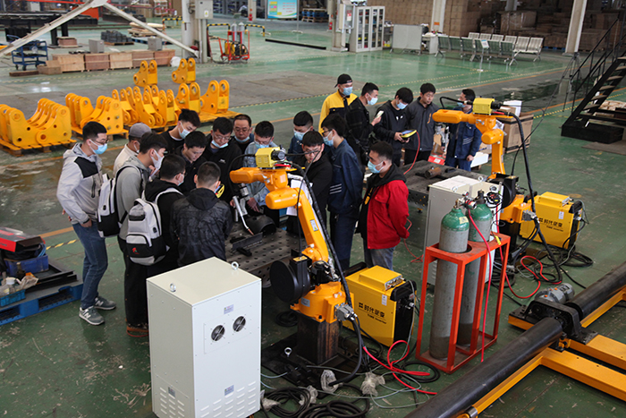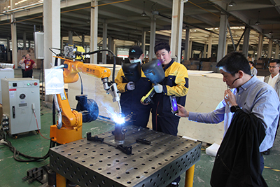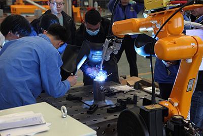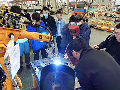 2021年4月26日,北京時代科技股份有限公司組織開設的2021年第一期手工+機器人焊接技能提升班在濟南時代焊接工業(yè)園開課了。全部課程為期5天,授課方式為技師現(xiàn)場授課、學員實操焊接練習。本次課程是時代公司精心籌劃的一個提升焊接專業(yè)學員機器人操作水平的培訓課。授課老師均為時代公司高級焊接技師。培訓設備為時代6公斤弧焊機器人、時代PNE61-400氬弧手工兩用焊機,時代全數(shù)字TDN 5001MB氣保焊機、A160-350半自動氣保焊機等。參加培訓的學員全部為國內(nèi)職業(yè)院校系統(tǒng)內(nèi)的年輕學員和教師。本次培訓內(nèi)容主要以實際操作為主,焊接理論為輔。實操內(nèi)容包括焊條電弧焊、熔化極氣體保護焊、鎢極氬弧焊和機器人熔化極混合氣體保護焊等。