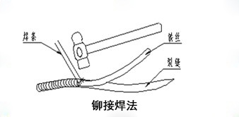 有些裂紋較寬或砂眼、氣孔直徑較大時(shí),采用錘擊捻壓法有困難,可先用合適的鐵絲或焊條頭將裂紋或孔洞先鉚住,以減少外漏的壓力和流量,然后再快速焊。有些裂紋的周邊不規(guī)則時(shí),可采用破布、薄木片、竹片塞進(jìn)去再快速焊。注意的要點(diǎn)是一次只能先堵塞一段,然后快速焊,堵塞一段焊一段。