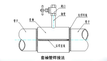 管道因磨損泄漏的面積較大時(shí),用一段同徑或正好包住泄漏管徑的管子,長短尺寸視泄漏處的面積而定。把用來做套袖的管子對稱切割成兩半,焊上一個(gè)導(dǎo)流管,具體焊法與導(dǎo)流焊接法相同。在焊接順序上應(yīng)先焊接管子與套袖的環(huán)縫,最后焊接套袖的焊縫。